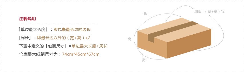 据订单打包完的纸箱实际重于体积重取较大者计算(体积重=长*宽*高/6000),只支持纸箱包装。此线路发送需使用无LOGO纸箱包装,若纸箱不符合发送要求,将自动更换仓库纸箱。限制纸箱尺寸请点击线路详情查看 |